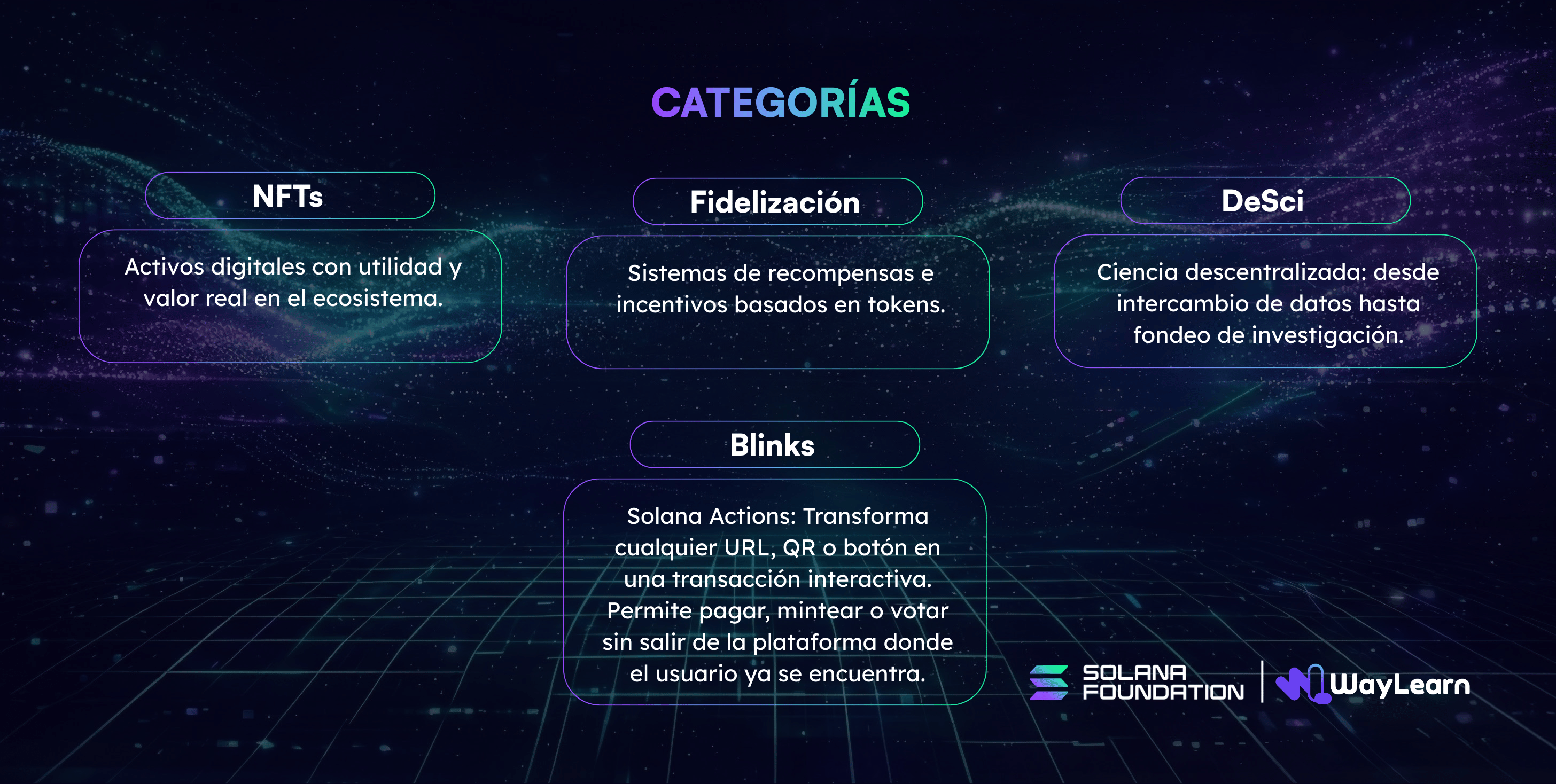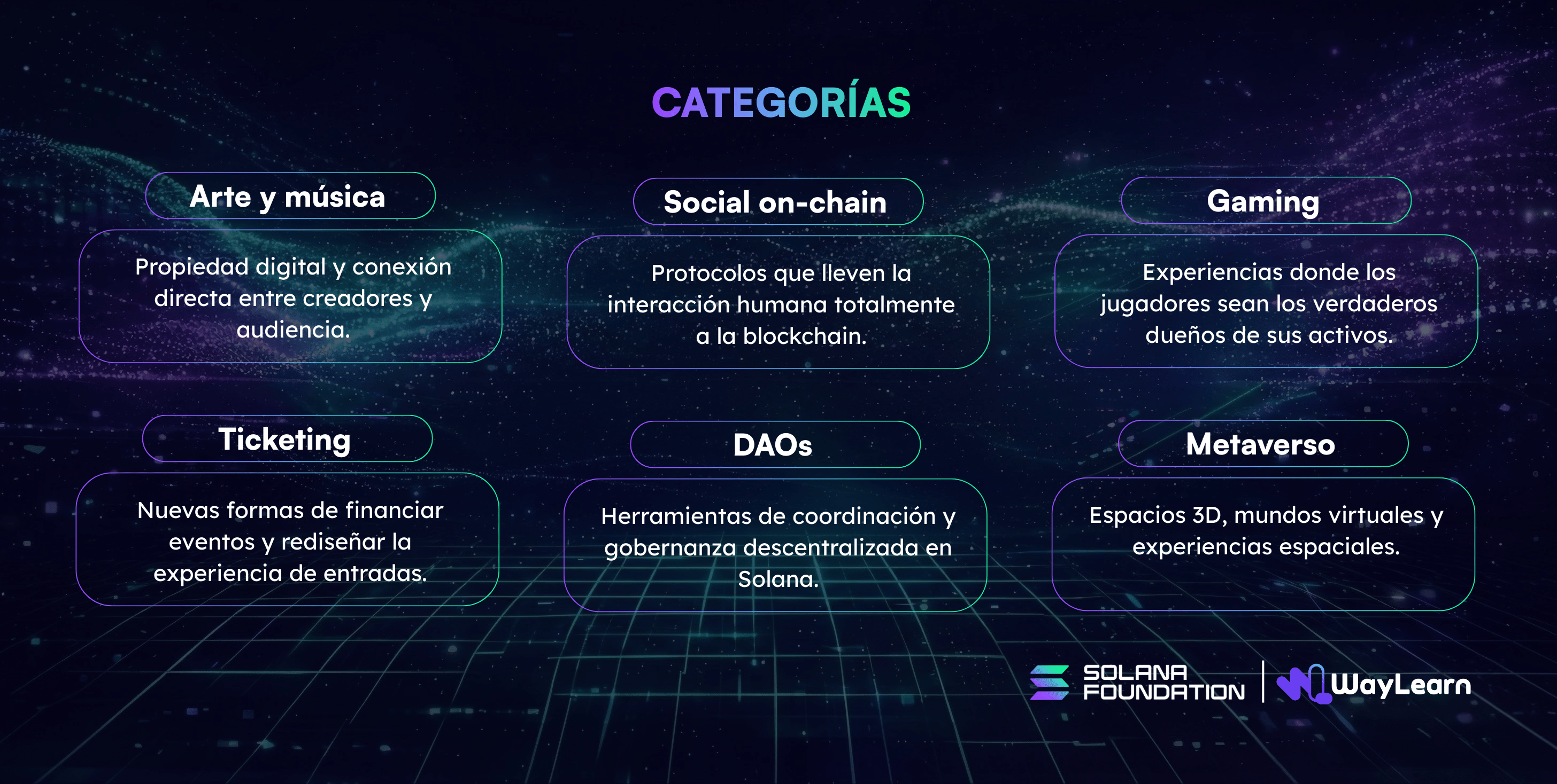 WayLearn es una iniciativa enfocada en educación y construcción en Web3, que impulsa el desarrollo de talento en Blockchain en Latinoamérica a través de bootcamps, hackathons y programas para desarrolladores.